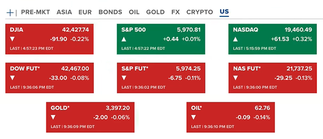 Thứ tư 04/06-US), chứng khoán Hoa Kỳ giảm 0.22% ở Dow Jones, còn S&P 500 và Nasdaq đều tăng nhẹ. Hợp đồng tương lai của chứng khoán giảm. Vàng và dầu cũng cùng xu hướng giảm về quanh 3397 USD/ounce và 62.76 USD/thùng.