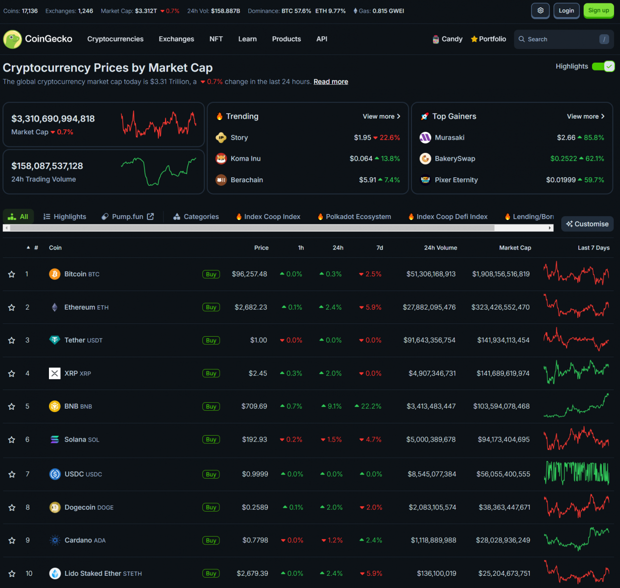 Bitcoin trong ngày biến động giảm và tăng lại trong thời gian ngắn, giá vẫn quanh 96,000 USD. Nhiều altcoin lớn tăng nhẹ, một số lại điều chỉnh giảm. Vốn hóa thị trường crypto là 3.31 nghìn tỷ USD.