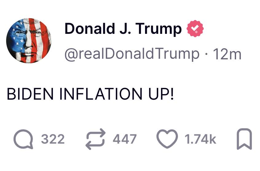 Sau khi có thông tin này, tổng thống Trump đã viết trên Truth Social: “LẠM PHÁT BIDEN TĂNG!”