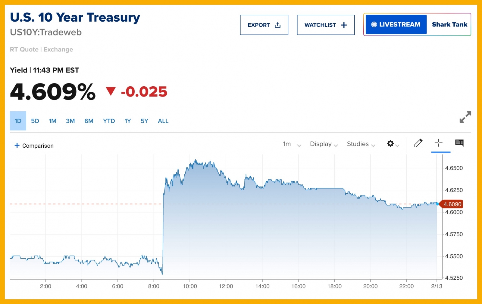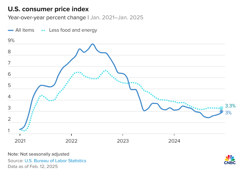 Tin khiến thị trường biến động là lạm phát CPI tháng 1 của Hoa Kỳ tăng cao hơn dự kiến, khiến Cục Dự trữ Liên bang (Fed) có khả năng trì hoãn việc cắt giảm lãi suất. Cụ thể, chỉ số giá tiêu dùng (CPI) tăng 3% hàng năm, vượt dự báo 2.8% và cũng cao hơn mức 2.9% của tháng trước đó. CPI cốt lõi (không tính thực phẩm và năng lượng) cũng cao hơn dự kiến ở mức 3.3% hàng năm, cao hơn mức 3.1% ước tính và mức 3.2% tháng trước đó. Nhìn chung, lạm phát đã tăng trở lại những tháng gần đây.