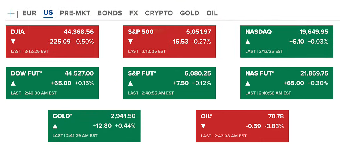 Chứng khoán Hoa Kỳ thứ tư (12/02-US) tiếp tục phân hóa, hai chỉ số Dow Jones và S&P 500 tiếp tục giảm, còn Nasdaq nghiêng về xu hướng tăng. Hợp đồng tương lai của chứng khoán tăng nhẹ ở cả ba chỉ số. Hợp đồng vàng tiếp tục tăng và đạt đỉnh mới quanh mức 2941 USD/ounce. Dầu giảm nhẹ về 70.78 USD/thùng.