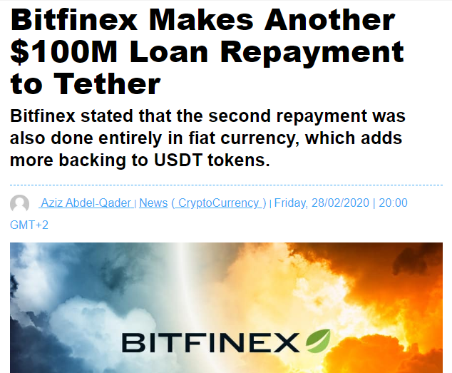 Khi sàn Bitfinex tiếp tục hoạt động và đồng USDT vẫn được người giao dịch dùng rất nhiều nên sàn này đã thu lại được doanh thu và trả lại được một phần khoản vay từ Tether. Tính đến hiện tại Bitfinex đã trả được 2 lần cho công ty Tether với số tiền 100 triệu USD (tương đương 20% số tiền vay) mỗi lần vào 07/2019 và tháng 02/2020 bằng tiền mặt thông qua ngân hàng.