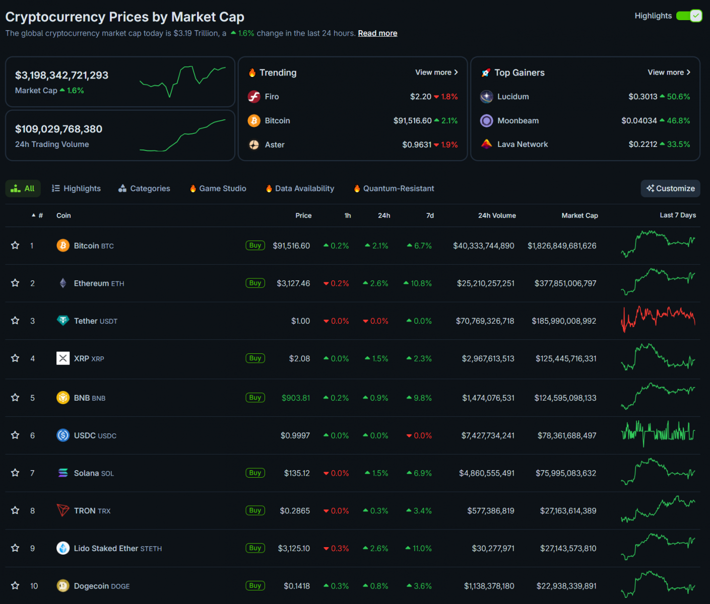 Bitcoin ngày qua tăng nhẹ lên 91,000 USD. Các altcoin lớn cũng tăng nhẹ. Vốn hóa thị trường crypto ở quanh 3.19 nghìn tỷ USD.