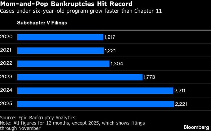 Ngày qua dù không có thông tin mới về kinh tế hay lãi suất từ bài phát biểu gần nhất, nhưng lại xuất hiện một thống kê đáng chú ý là làn sóng phá sản và sa thải đang gia tăng tại Mỹ, đặc biệt trong nhóm doanh nghiệp nhỏ. Số hồ sơ phá sản theo chương Subchapter V đã vượt 2,200 trường hợp trong năm nay, cao hơn cả năm trước dù năm hiện tại còn chưa kết thúc. Subchapter V là phiên bản đơn giản, nhanh và rẻ của Chapter 11, cho phép doanh nghiệp nhỏ tái cấu trúc nợ mà không phải đóng cửa như Chapter 7. Nhờ cơ chế tái cấu trúc này, nhiều doanh nghiệp Mỹ có thể phá sản nhiều lần nhưng vẫn tiếp tục hoạt động.
