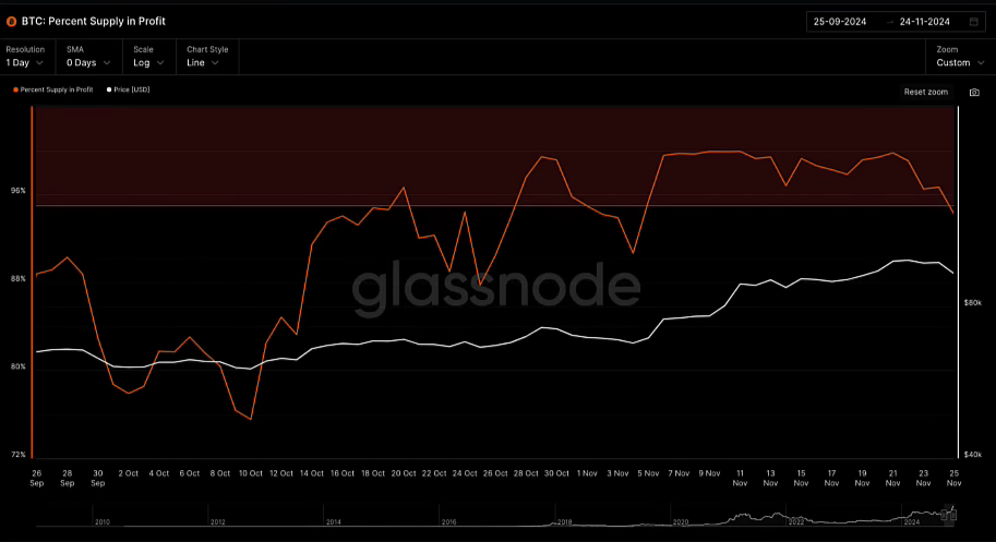 Tỷ lệ BTC có lời điều chỉnh xuống 94.1%, xuống ngay dưới vùng màu đỏ. BTC đã nguội lại một chút.