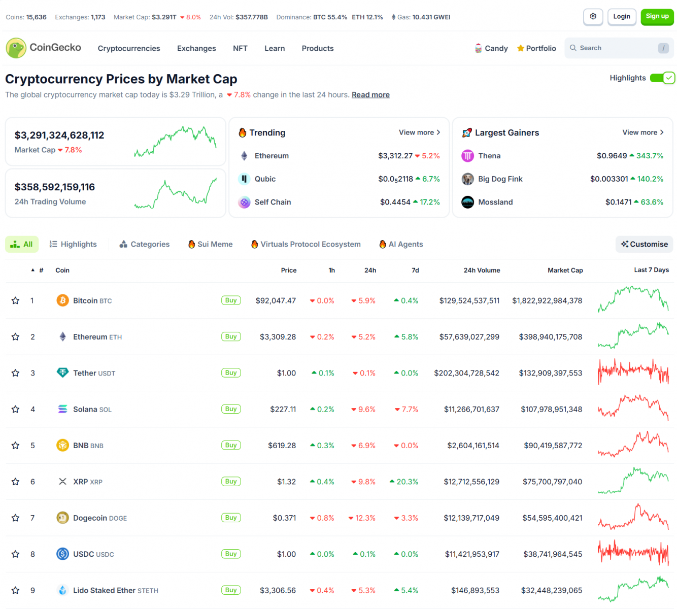 Bitcoin đã điều chỉnh về quanh 94,000 USD và sau đó tiếp tục xuống 92,000 USD. Các altcoin lớn đa số giảm, vẫn còn một số altcoin nhỏ tăng. Vốn hóa thị trường crypto ở mức 3.29 nghìn tỷ USD.