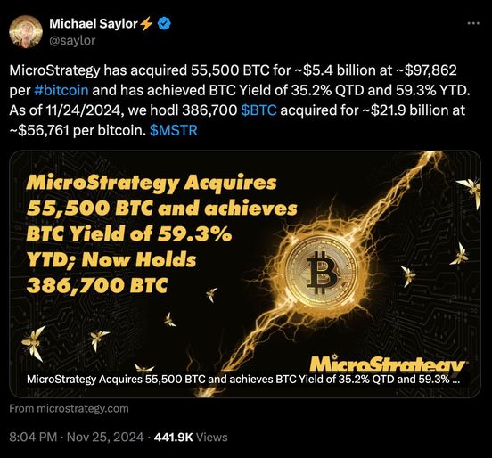 Trong hồ sơ nộp lên SEC, MicroStrategy cho biết họ đã chi 5.4 tỷ USD để mua Bitcoin trong khoảng thời gian từ ngày 18 tháng 11 đến ngày 24 tháng 11 với giá trung bình là 97,862 USD. Tổng số BTC họ nắm giữ sau khi mua thêm là 386,700 BTC với mức giá trung bình 56,761 USD.