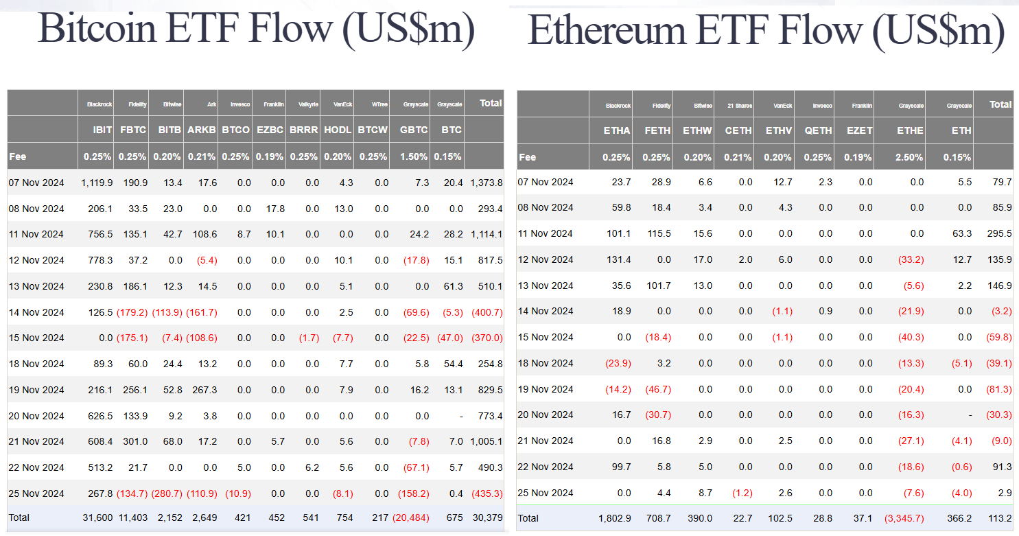 Các quỹ BTC spot ETF Hoa Kỳ đã có dòng tiền rời khỏi sau nhiều phiên liên tục có dòng tiền vào lớn. Tổng dòng tiền rời khỏi trong thứ hai (25/11) là 435 triệu USD. Trong đó, phần lớn các quỹ có dòng tiền ra trong khi IBIT của BlackRock vẫn có dòng tiền vào. Còn ETH spot ETF lại có dòng tiền vào 2.9 triệu USD.