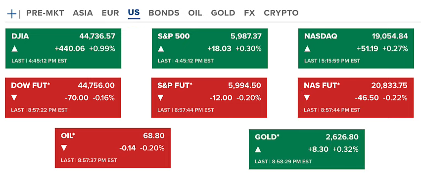 Chứng khoán Hoa Kỳ thứ hai (25/11) kết thúc với sự tăng trưởng ở cả ba chỉ số. Ngược lại, hợp đồng tương lai của chứng khoán giảm nhẹ. Giá hợp đồng dầu giảm về 68.8 USD/thùng. Vàng ở quanh mức 2626 USD/ounce.