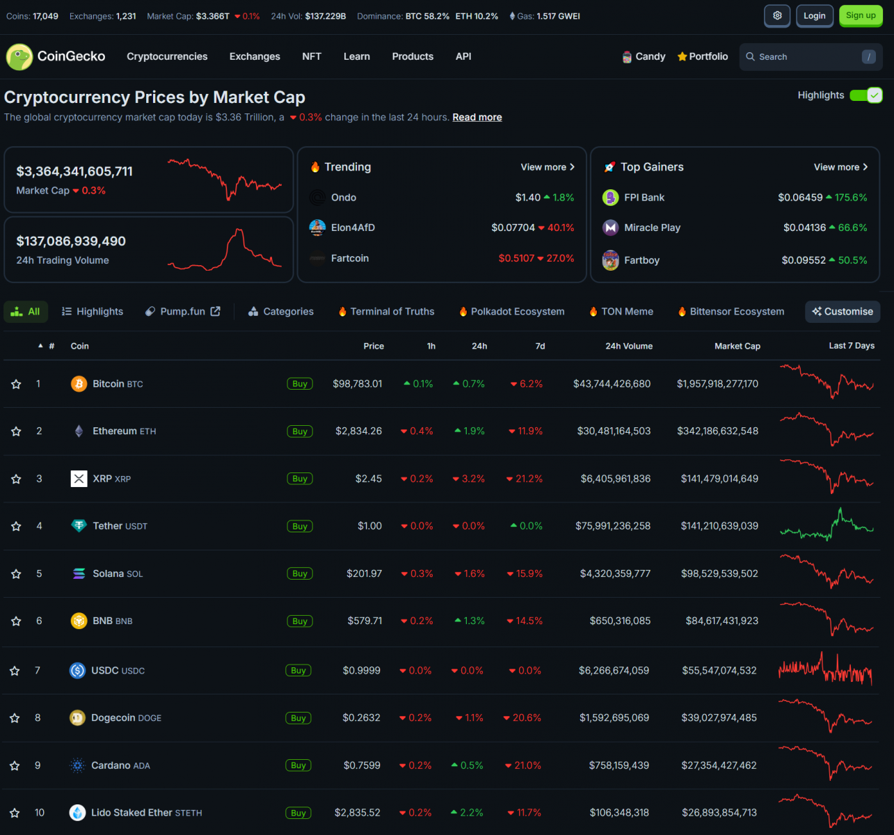 Bitcoin vẫn quanh mức 98,000 USD. Một số altcoin điều chỉnh nhẹ, một số tăng. Vốn hóa thị trường crypto là 3.36 nghìn tỷ USD.