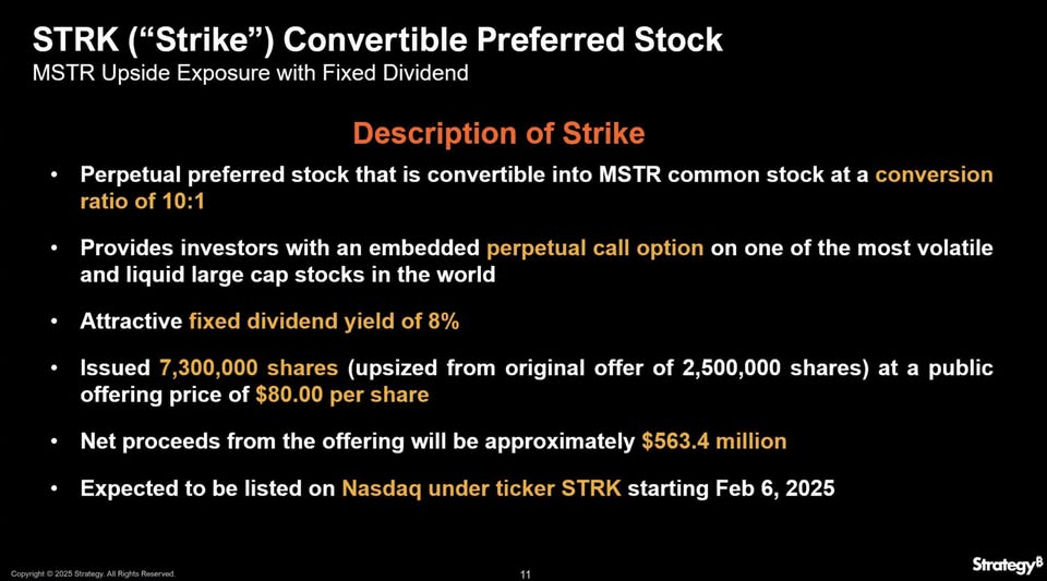 Bên cạnh đó, Strategy₿ của Michael Saylor dự kiến cổ phiếu ưu đãi có thể chuyển đổi STRK sẽ được niêm yết trên Nasdaq vào thứ năm. Cổ phiếu ưu đãi STRK có thể chuyển đổi thành cổ phiếu MSTR theo tỷ lệ 10:1, đi kèm quyền chọn mua vĩnh viễn và lợi suất cổ tức cố định 8%.