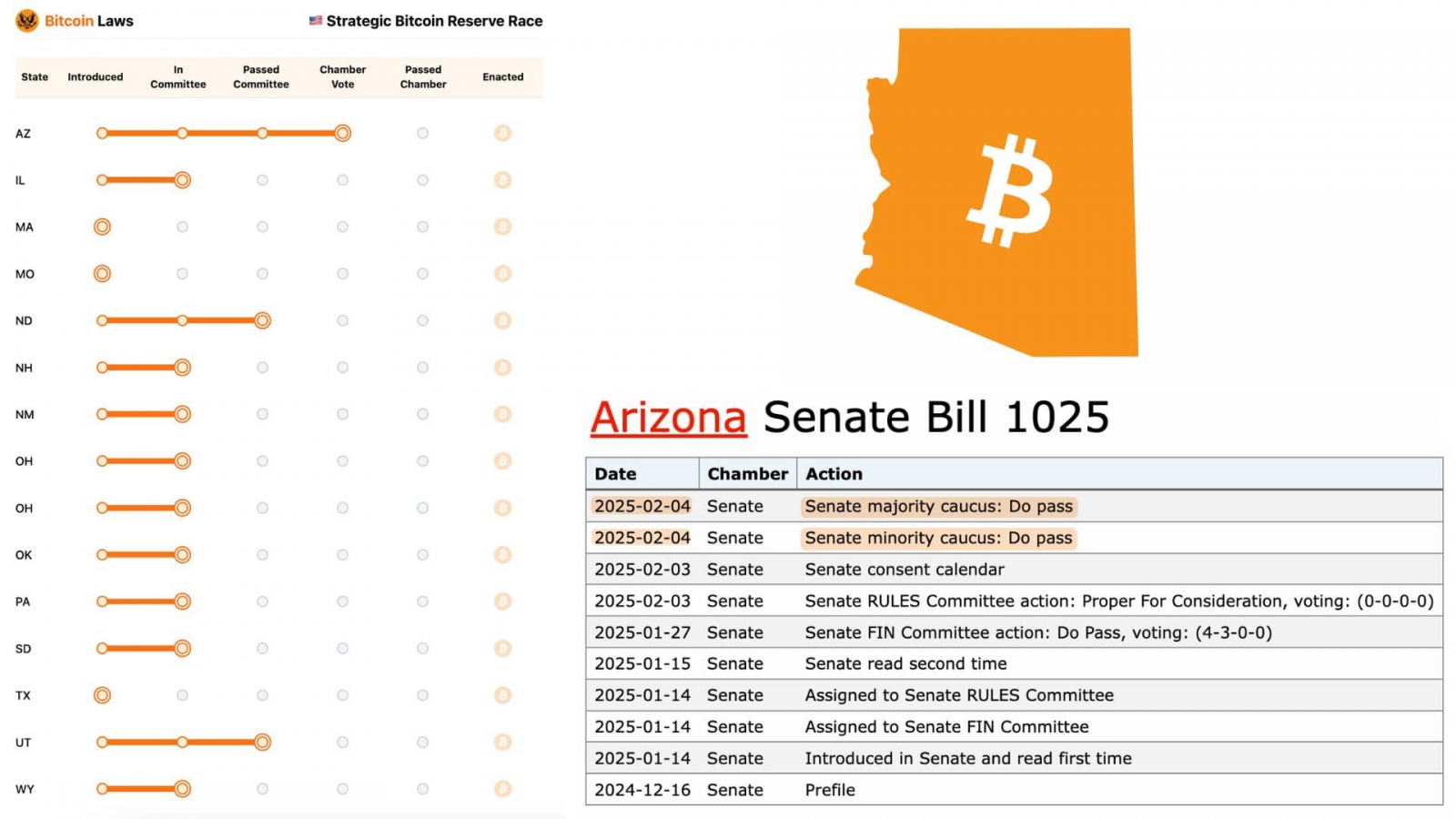 Cuộc đua dự trữ Bitcoin giữa các bang tại Mỹ đang nóng lên với Arizona dẫn đầu. Dự luật Thượng viện SB 1025 của Arizona đã vượt qua các cuộc bỏ phiếu của các ủy ban, hiện đang chờ được đưa ra bỏ phiếu toàn thể.