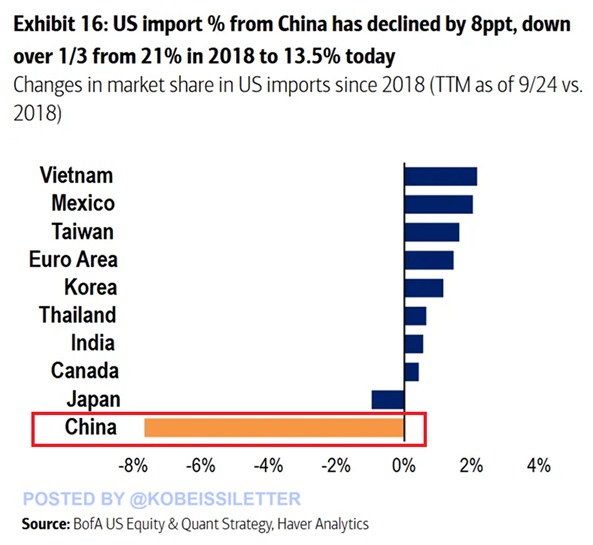 Khi Mỹ chuẩn bị đàm phán về thuế quan với Trung Quốc, cần lưu ý rằng nhập khẩu từ Trung Quốc vào Mỹ đã giảm 8% kể từ năm 2018, hiện chỉ chiếm 13.5% tổng nhập khẩu.