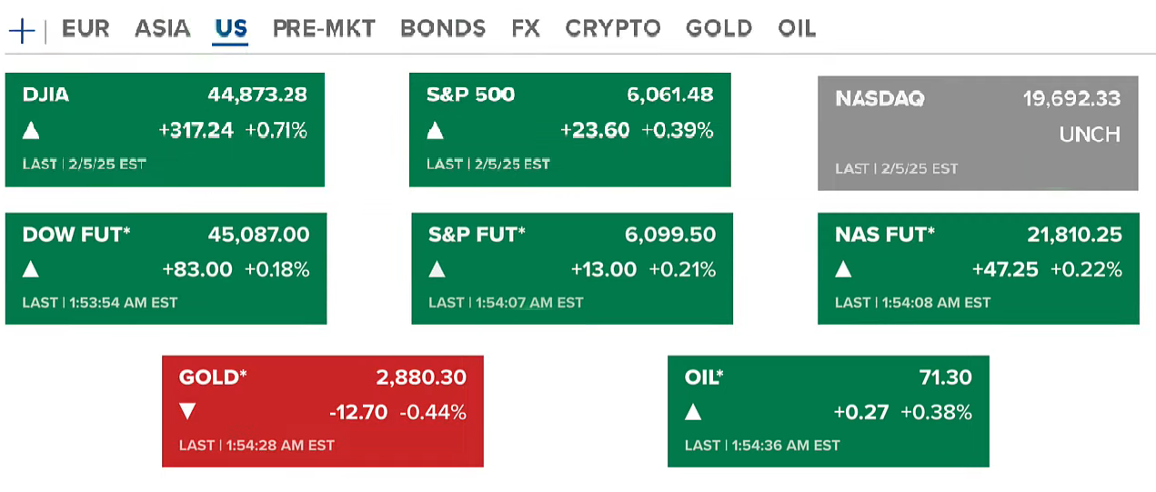 Chứng khoán Hoa Kỳ thứ tư (5/02-US) tiếp tục tăng ở hai chỉ số Dow Jones và S&P 500, còn Nasdaq không thay đổi. Hợp đồng tương lai của chứng khoán tiếp tục là xu hướng tăng. Giá hợp đồng vàng dù giảm nhẹ nhưng vẫn ở mức cao 2880 USD/ounce. Hợp đồng dầu không tăng gần đây và quanh 71.3 USD/thùng.