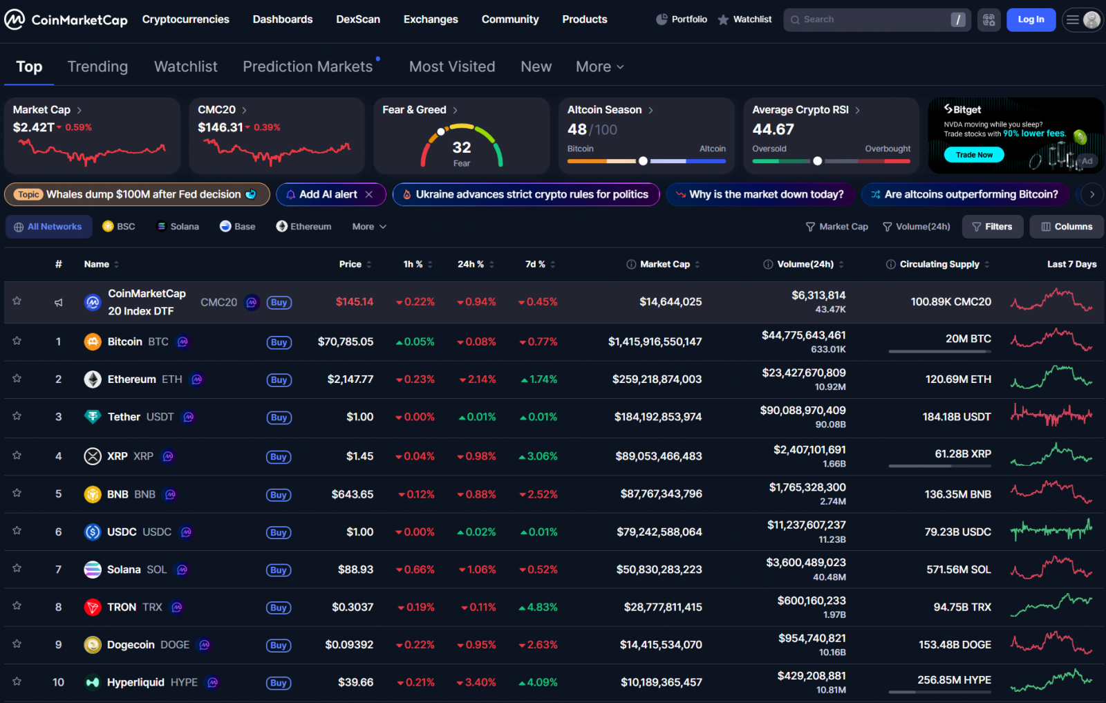 Bitcoin cũng giảm về quanh 70,700 USD. Hầu hết altcoin đều giảm. Vốn hóa thị trường crypto cũng giảm về 2.42 nghìn tỷ USD.