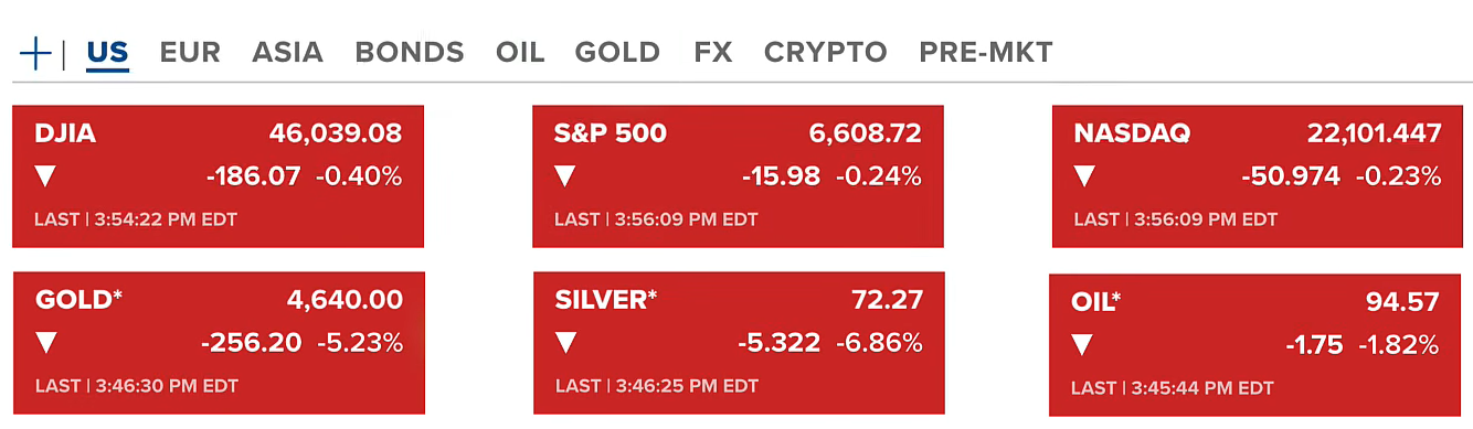 Các chỉ số chứng khoán lớn của Mỹ thứ năm (19/03-US) như Dow Jones, S&P 500 và Nasdaq đồng loạt đi xuống. Trong khi vàng và bạc cũng ghi nhận mức giảm mạnh về quanh 4640 USD/ounce và 72.27 USD/ounce. Dầu giảm nhẹ nhưng vẫn ở mức cao 94.57 USD/thùng.