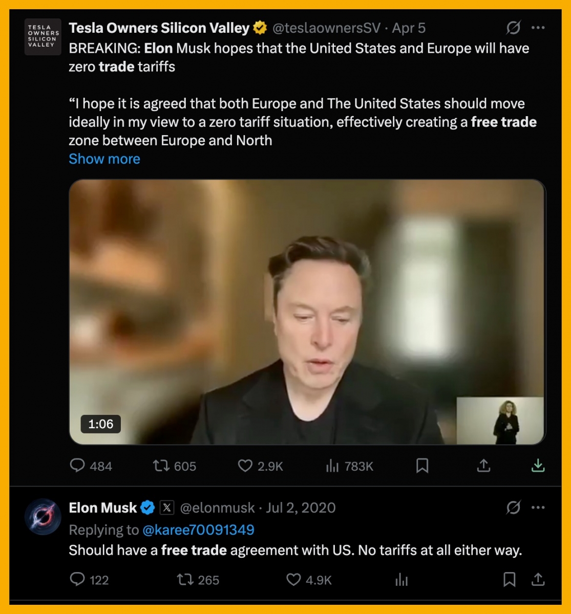 Một số người đã cáo buộc Elon Musk có xung đột lợi ích, vì Tesla bị ảnh hưởng bởi các mức thuế khi vẫn cần nhập khẩu linh kiện để sản xuất xe. Có thể đúng… nhưng cũng cần lưu ý rằng Elon từ lâu đã là người ủng hộ thương mại tự do, đây cũng là quan điểm mà Elon đã từng bày tỏ từ năm 2020.