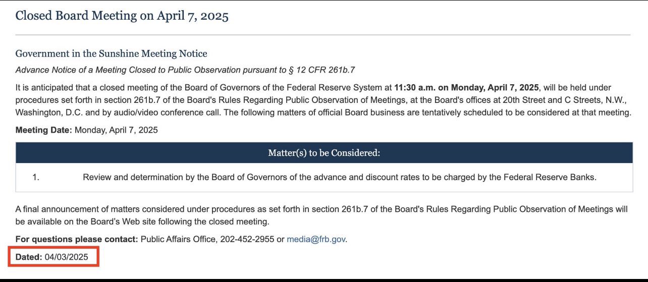 Sau đó, có thông tin FED sẽ tổ chức một cuộc họp kín trong ngày 06/04. Cuộc họp kín này đã được thông báo vào ngày 3 tháng 4, một ngày sau khi thông báo về thuế quan được đưa ra.