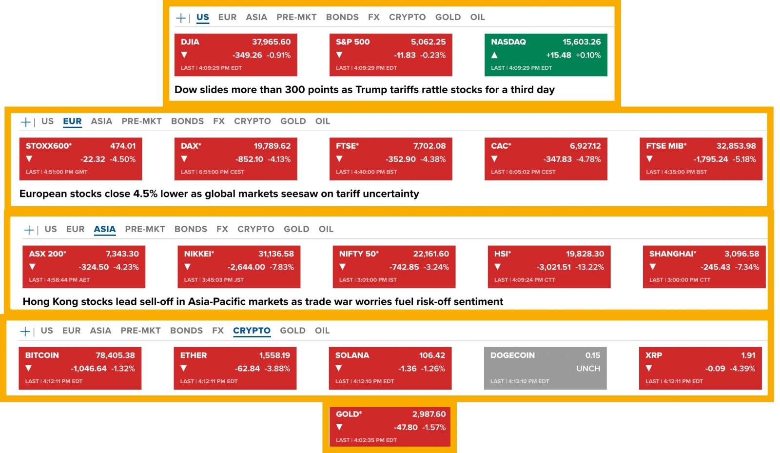 Trong khi đó, thị trường châu Âu và châu Á cũng chìm trong sắc đỏ, với chỉ số HSI của Hồng Kông giảm hơn 13% và chỉ số Thượng Hải của Trung Quốc giảm hơn 7% chỉ trong một ngày.