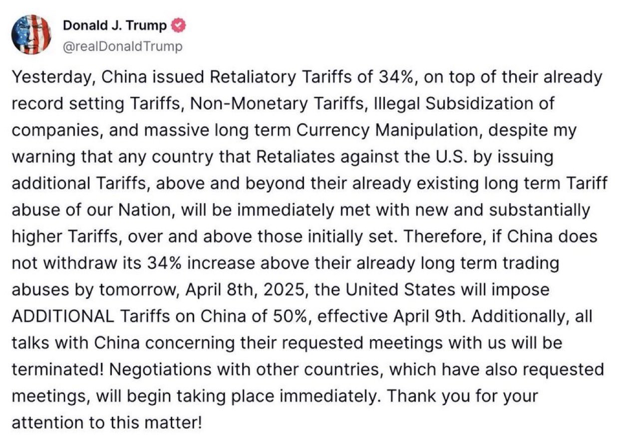 Còn Trung Quốc, tổng thống Trump tuyên bố nếu Trung Quốc không rút lại mức tăng thuế trả đũa 34% trước ngày 8/4/2025, Mỹ sẽ áp thêm thuế 50% đối với Trung Quốc kể từ ngày 9/4.