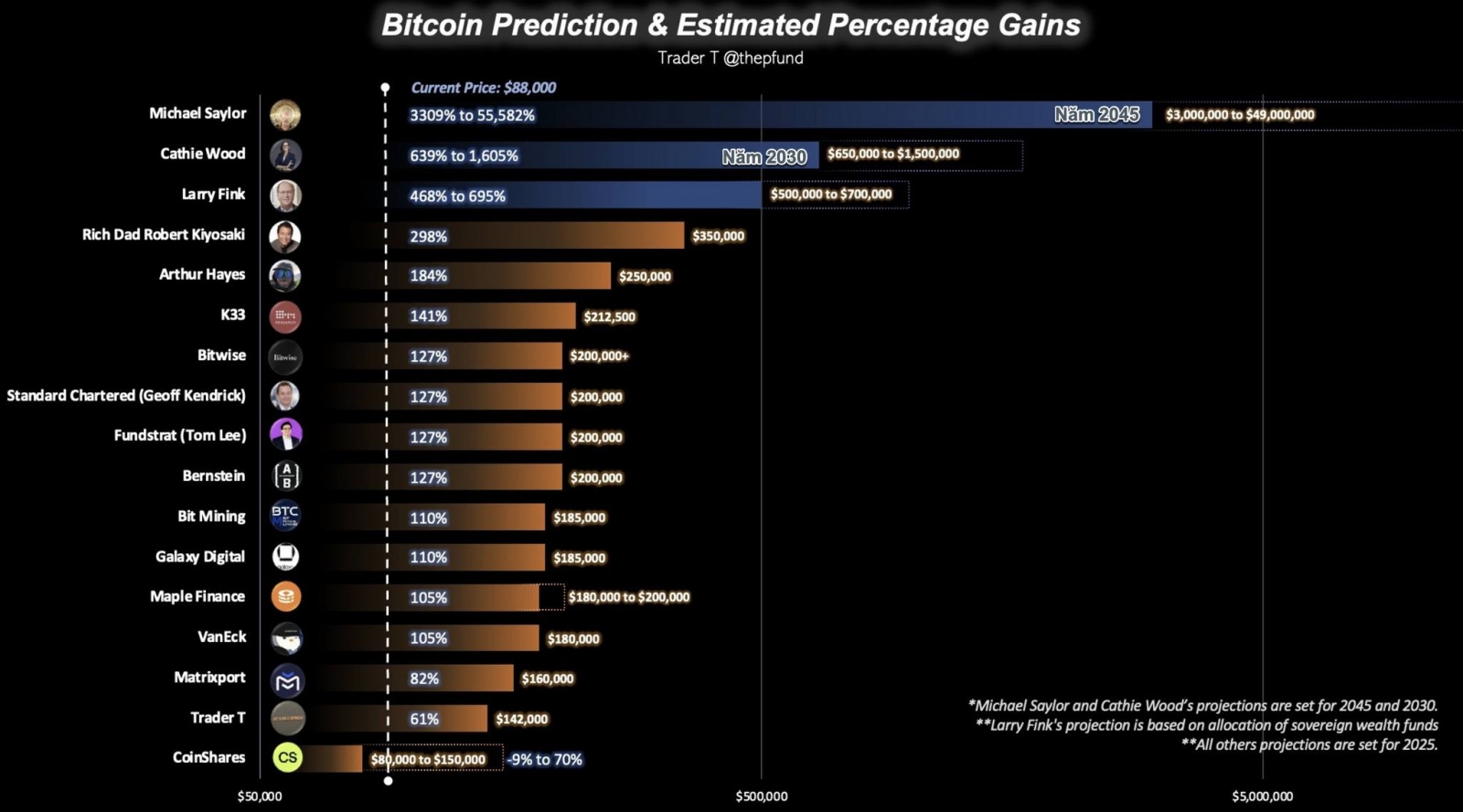Việc thành lập Quỹ Dự trữ Bitcoin của Mỹ đã làm dấy lên nhiều dự đoán về giá BTC trong thời gian tới. Tuy nhiên, không phải mọi dự báo đều phù hợp để xem xét trong ngắn hạn. Chẳng hạn, Michael Saylor dự đoán giá Bitcoin vào năm 2045, trong khi Cathie Wood đặt mục tiêu cho năm 2030.