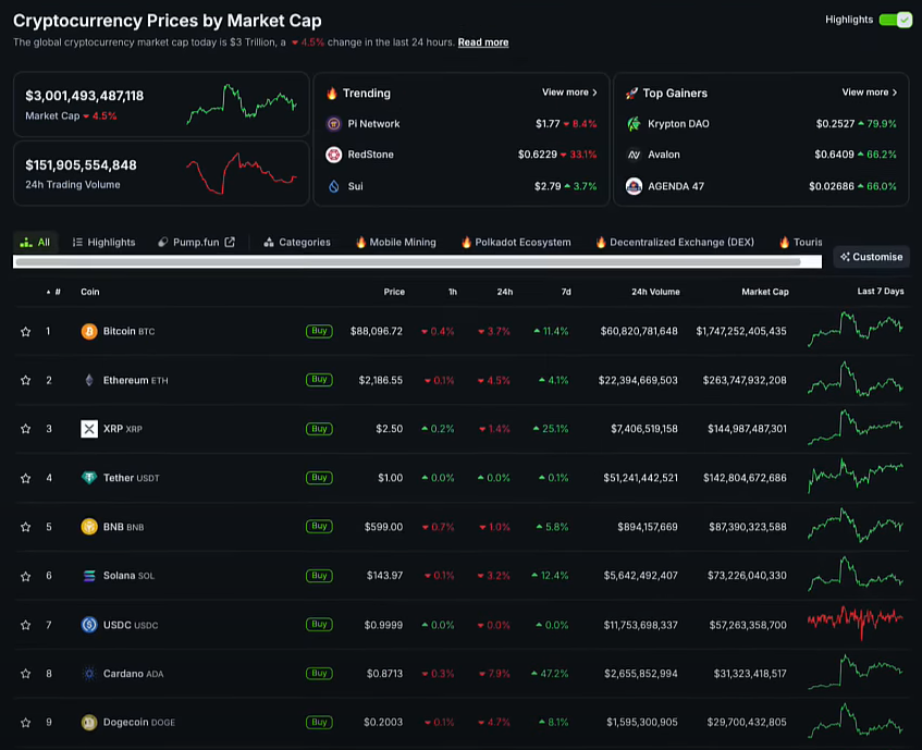 Về crypto, Bitcoin cũng giảm về quanh 88,000 USD sau khi hồi nhẹ từ mức giảm về 83,000 USD trước đó. Các altcoin lớn vẫn giảm trong ngày qua.Vốn hóa thị trường crypto là 3 nghìn tỷ USD.