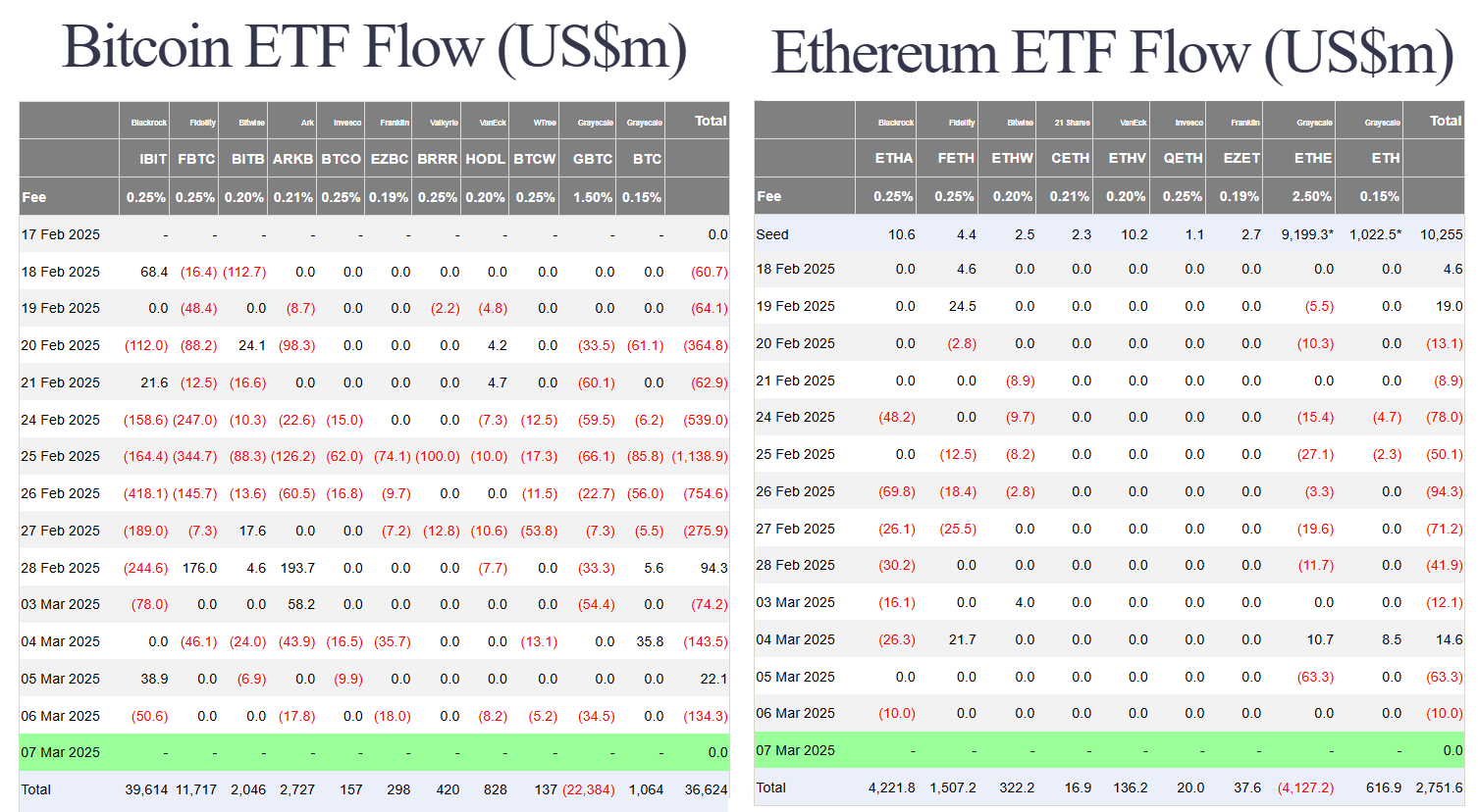 Các quỹ BTC spot ETF Hoa Kỳ vẫn tiếp tục có dòng tiền rời khỏi trong thứ năm (06/03-US). Tổng dòng tiền rời khỏi các quỹ BTC ETF là 134.3 triệu USD đến từ đa số các quỹ. Tương tự, ETH spot ETF cũng có dòng tiền ra 10 triệu USD đến từ quỹ ETHA của BlackRock.