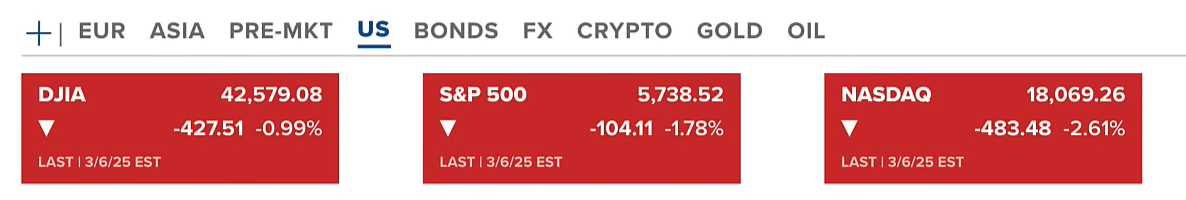 Chứng khoán Hoa Kỳ tiếp tục giảm bởi những tin xấu từ thuế quan. Cả ba chỉ số Dow Jones, S&P 500 và Nasdaq đều giảm mạnh trong thứ năm (06/03-US).