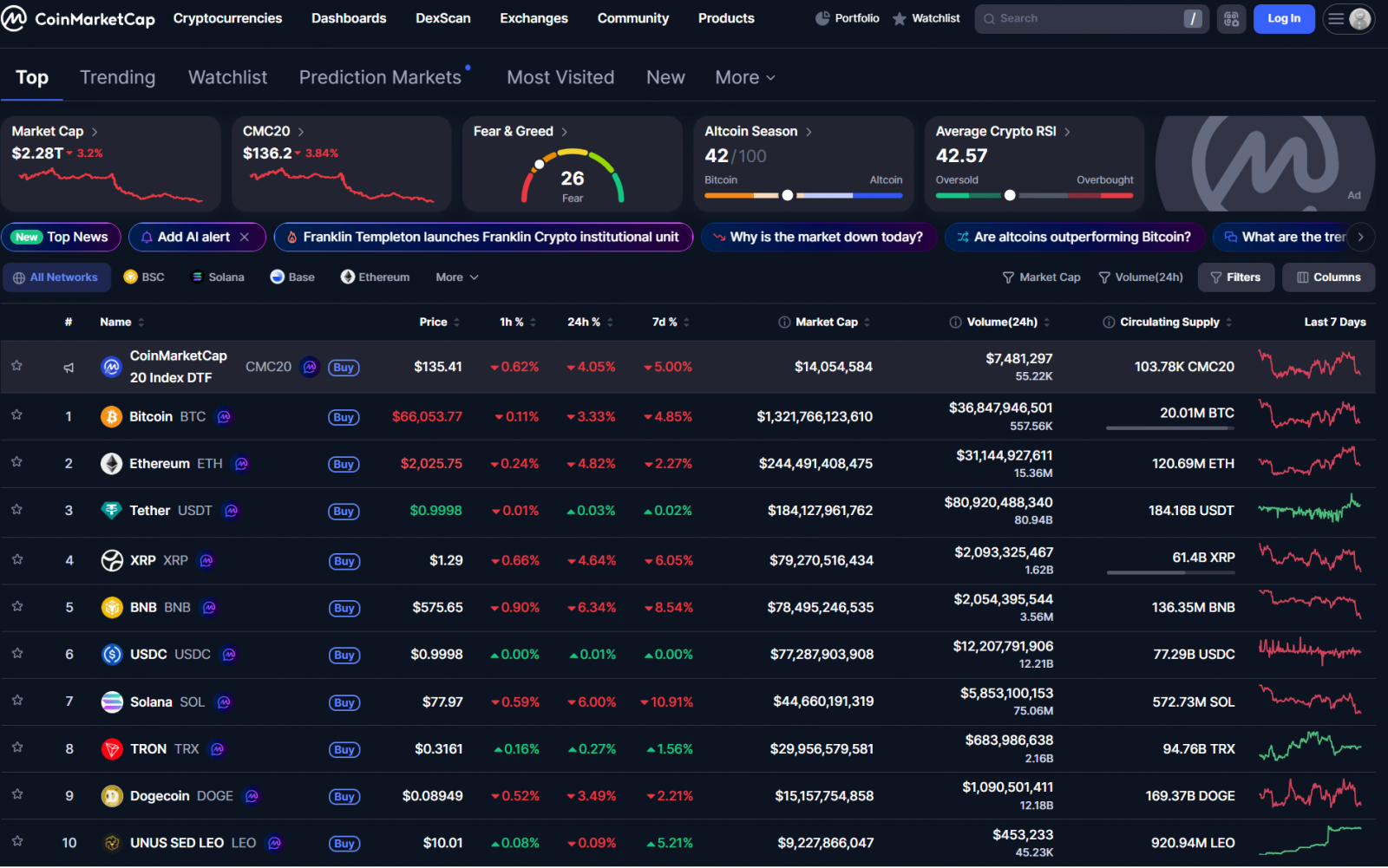 Bitcoin sau khi tăng lên 68,000 USD đã giảm về quan 66,000 USD. Các altcoin lớn đều giảm khi BTC điều chỉnh. Vốn hóa thị trường crypto là 2.28 nghìn tỷ USD.