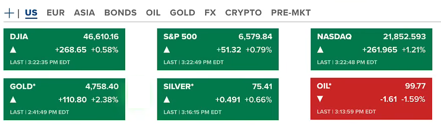 Chứng khoán Hoa Kỳ thứ tư (01/04-US) gần cưới phiên các chỉ số đều tăng nhẹ, trong đó Nasdaq tăng nhiều nhất 1.21%. Hợp đồng tương lai của dầu và vàng cũng tăng lên lần lượt 4758 USD/ounce và 75.41 USD/ounce. Còn dầu điều chỉnh nhẹ về quanh 99.77 USD/thùng.