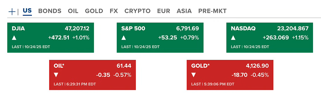 Chứng khoán Hoa Kỳ thứ sáu (24/10-US) kết thúc cả ba chỉ số đều tăng sau khi có báo cáo CPI. Hợp đồng dầu điều chỉnh nhẹ ở quanh 61.4 USD/thùng. Vàng ở mức 4126 USD/ounce.