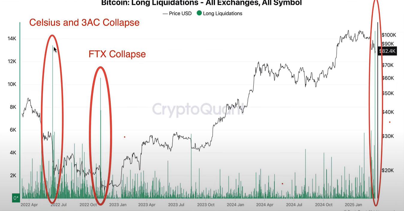 Giá BTC giảm sâu khiến cho lượng lớn lệnh đòn bẩy bị thanh lý. Trong đó, phần lớn là lệnh Long, số lượng lệnh Long bị thanh lý cao hơn cả thời điểm các công ty Celsius, 3AC và FTX sụp đổ.
