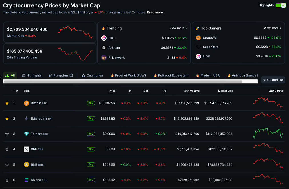 Bitcoin và crypto cũng cùng xu hướng điều chỉnh đáng kể. Bitcoin giảm về mức thấp quanh 76,000 USD và sau đó có hồi lại về 80,000 USD. Giá BTC đã giảm khoảng 30% từ giá đỉnh gần nhất với giá thấp nhất trong ngày. Còn hầu hết altcoin giảm. Vốn hóa thị trường crypto giảm về 2.7 nghìn tỷ USD.