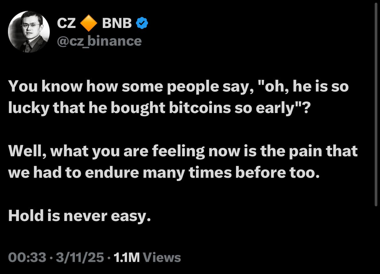 “Nhiều người nói, ‘Anh ấy thật may mắn khi mua Bitcoin từ sớm.’ Nhưng thực ra, cảm giác bạn đang trải qua lúc này chính là những gì chúng tôi đã phải chịu đựng nhiều lần trước đây. Hold chưa bao giờ là điều dễ dàng.”