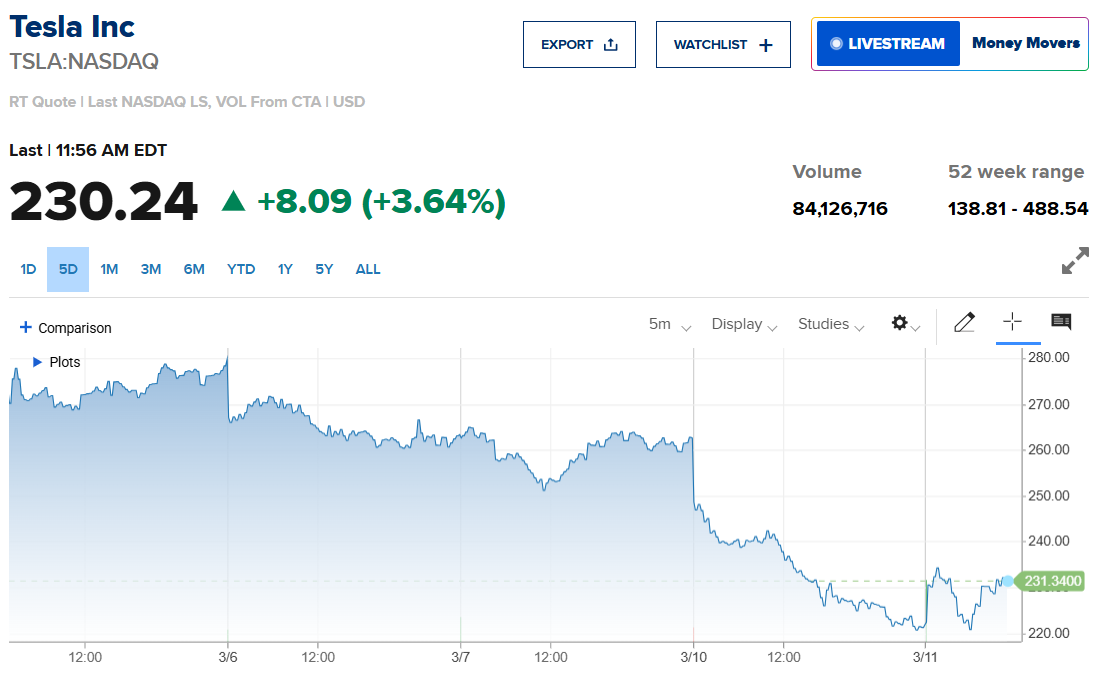 Cổ phiếu Tesla giảm mạnh do lo ngại về thuế quan và sự phân tâm của Elon Musk, phục hồi sau tuyên bố của Trump. Cổ phiếu Tesla (TSLA) giảm 15% trong phiên giao dịch hôm nay, đánh dấu mức giảm mạnh nhất trong 5 năm qua và hiện đã mất 50% giá trị so với đỉnh cao nhất. Nguyên nhân chính đến từ sự bất ổn liên quan đến thuế quan, khi Tesla vừa xuất khẩu xe điện vừa nhập khẩu linh kiện, khiến công ty chịu rủi ro lớn từ các chính sách thương mại.