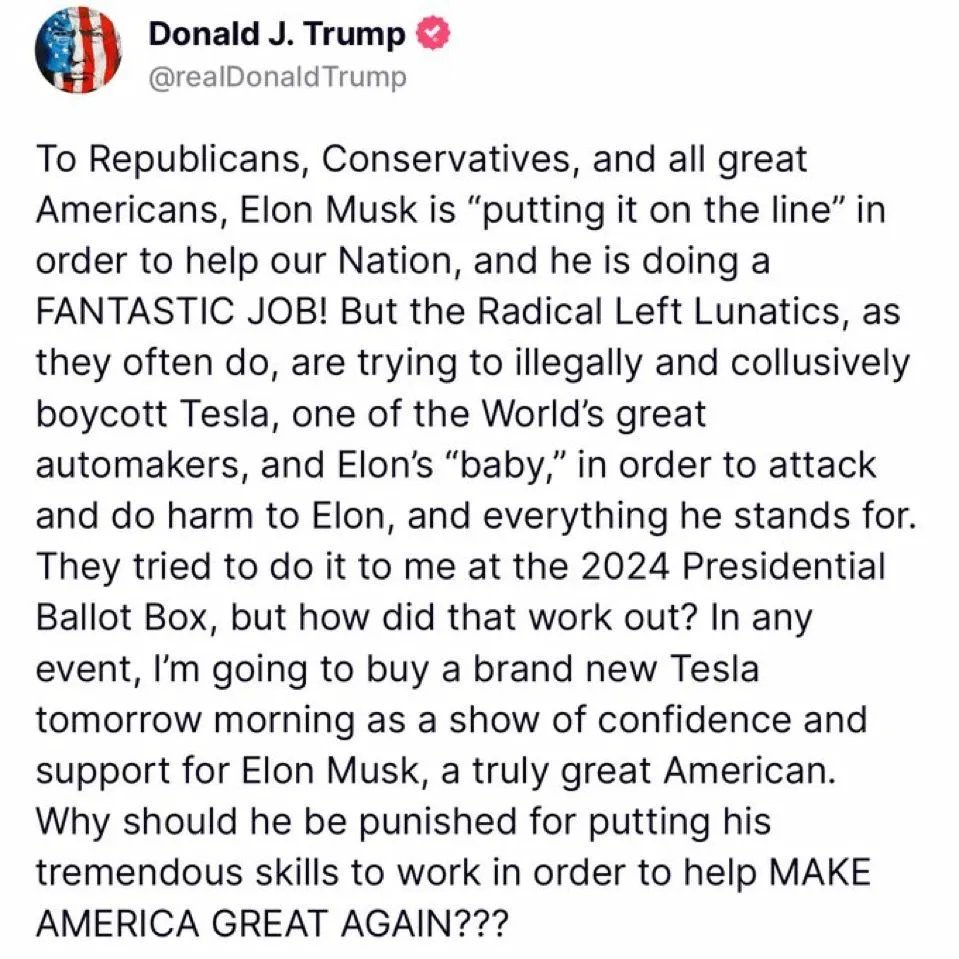 Giữa bối cảnh cổ phiếu lao dốc, Tổng thống Donald Trump đã lên tiếng ủng hộ Elon Musk, tuyên bố rằng ông sẽ mua một chiếc Tesla hoàn toàn mới để thể hiện niềm tin vào Musk. Trump cũng chỉ trích việc Tesla bị tẩy chay vì lý do chính trị. Ngay sau tuyên bố này, cổ phiếu Tesla đã hồi phục hơn 6% từ mức thấp nhất trong đêm.