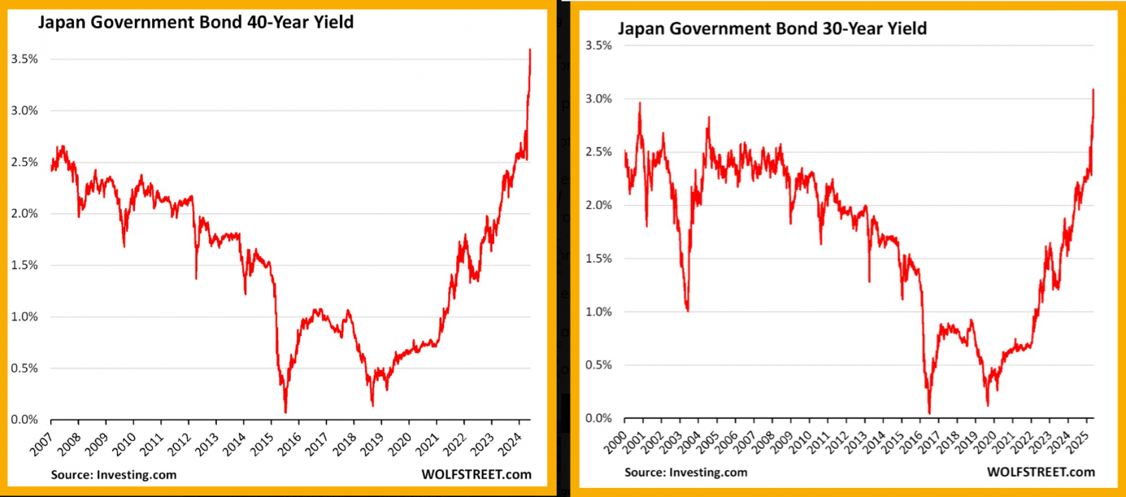 Lạm phát tại Nhật hiện đã vượt Mỹ (CPI 3.6%), khiến lợi suất trái phiếu chính phủ Nhật Bản kỳ hạn 30 và 40 năm tăng mạnh. Riêng lợi suất 40 năm đã tăng 1% kể từ tháng 4, lên mức 3.56%. Những nhà đầu tư từng mua trái phiếu với lợi suất siêu thấp đang chịu lỗ nặng, trong khi Ngân hàng Trung ương Nhật Bản đẩy nhanh quá trình thắt chặt định lượng (QT), cắt giảm 25 nghìn tỷ yên (tương đương 172 tỷ USD) trái phiếu kể từ đầu năm 2024.