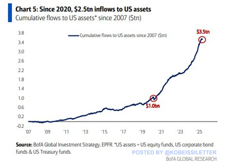 Kể từ năm 2007, các dòng tiền đổ vào tài sản Mỹ đã cực kỳ lớn, với tổng cộng 3.5 nghìn tỷ USD chảy vào quỹ cổ phiếu, trái phiếu doanh nghiệp và trái phiếu chính phủ Mỹ.