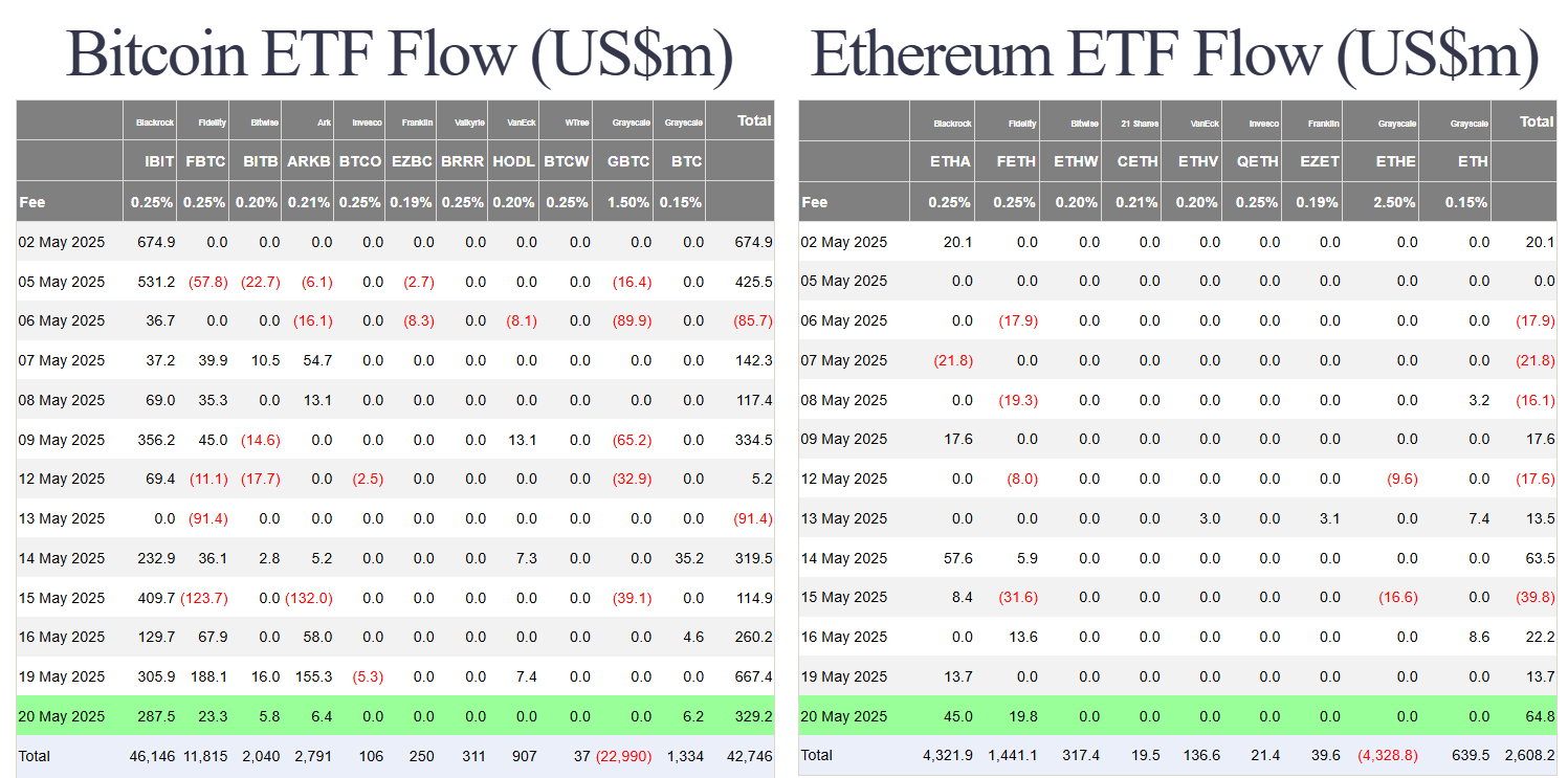 Các quỹ BTC spot ETF Hoa Kỳ tiếp tục có dòng tiền vào dương 329.2 trệu USD trong thứ  ba (20/05-US) và chủ yếu đến từ IBIT của BlackRock. Còn ETH spot ETF cũng có dòng tiền vào 64.8 triệu USD.