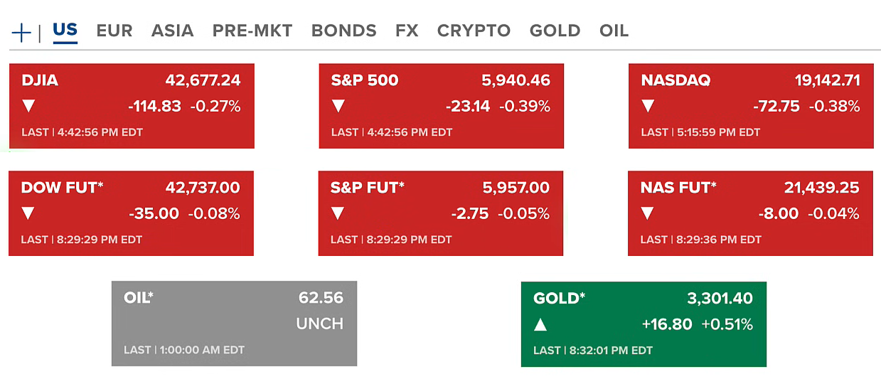 Chứng khoán Hoa Kỳ thứ ba (20/05-US) giảm nhẹ ở cả ba chỉ số với mức giảm quanh 0.3%. Hợp đồng tương lai của chứng khoán cũng giảm nhẹ. Dầu vẫn quanh 62.5 USD/thùng dù trong phiên có sự biến động bởi tin tức liên quan đến căng thẳng vùng vịnh. Vàng tăng lên 3301 USD/ounce.