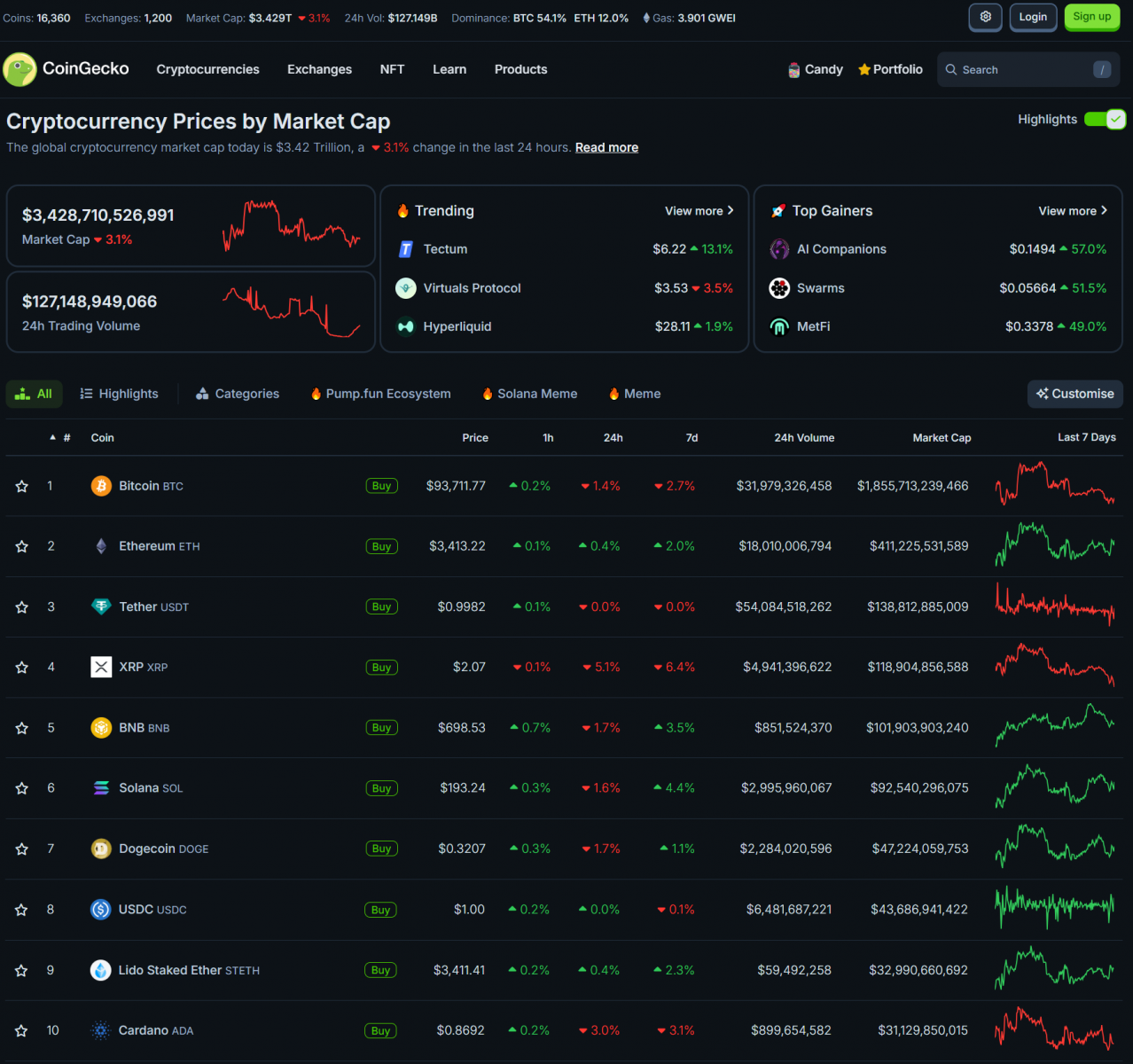 Còn BTC cũng đã tăng hơn 121% cho đến thời điểm này. Giá BTC ngày qua quanh mức 93,000 USD. Nhiều altcoin lớn giảm nhẹ. Vốn hóa thị trường crypto là 3.428 nghìn tỷ USD.