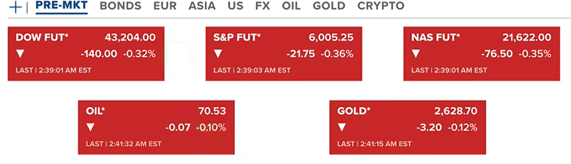 Chủ nhật tại Hoa Kỳ (29/12-US), thị trường hợp đồng tương lai của chứng khoán vẫn xu hướng giảm ở cả ba chỉ số. Hợp đồng dầu cũng giảm về quanh 70.5 USD/thùng. Vàng cũng dao động quanh 2628 USD/ounce.