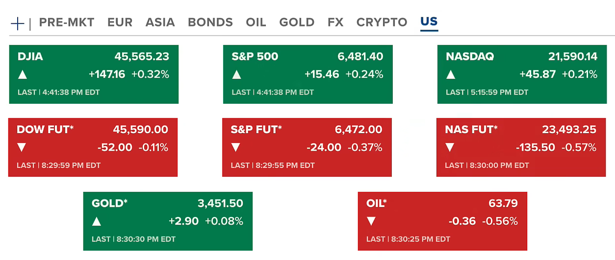 Chứng khoán Hoa Kỳ tăng nhẹ ở cả ba chỉ số khi kết thúc phiên thứ tư (27/08-US). Ngược lại, hợp đồng tương lai của chứng khoán giảm nhẹ. Hợp đồng vàng tăng nhẹ lên 3451 USD/ounce. Dầu ở mức 63.7 USD/thùng.
