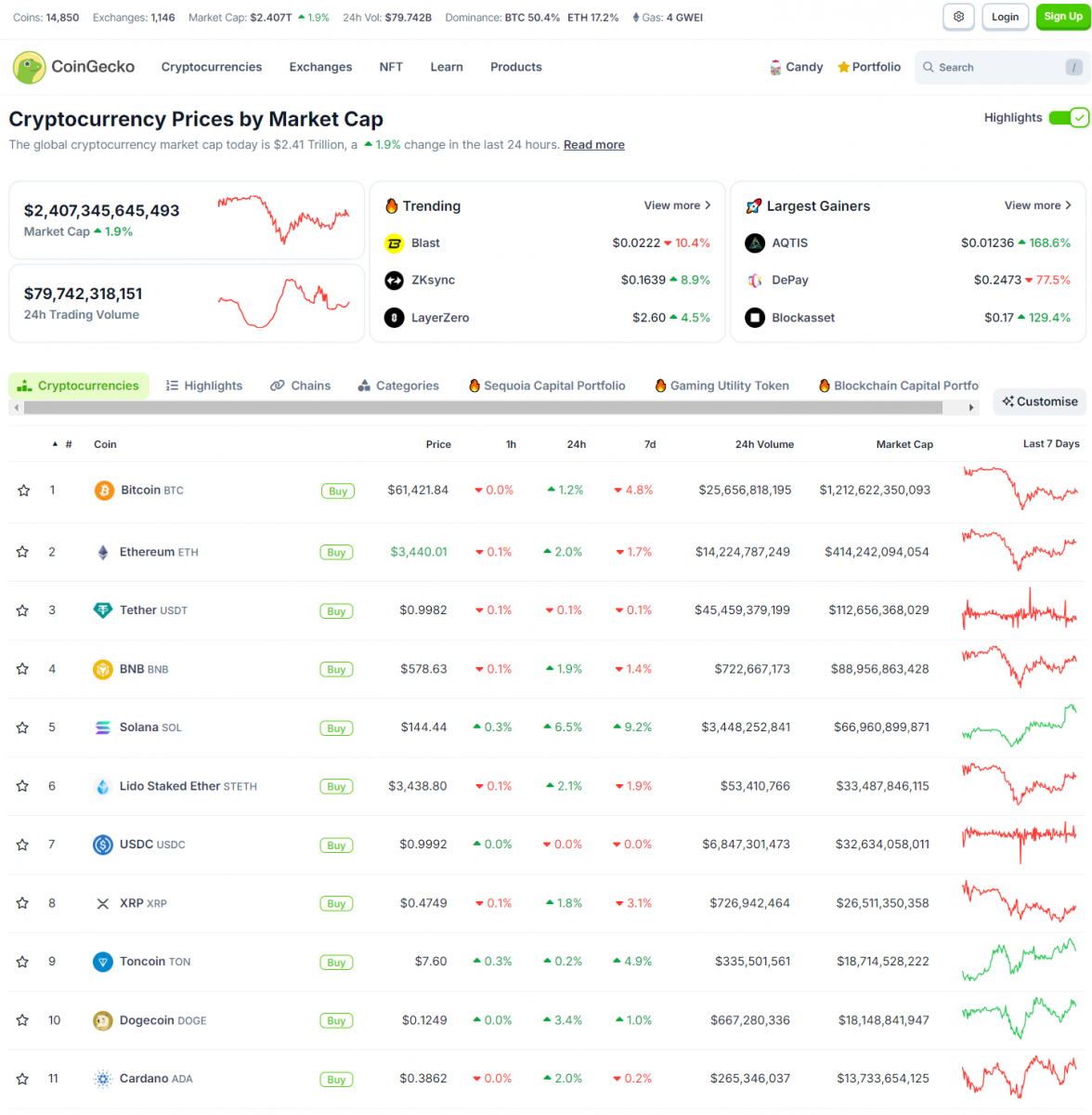 Về crypto, Bitcoin hồi phục nhẹ về quanh 61,400 USD. Đa số các altcoin tăng. Vốn hóa thị trường crypto cũng tăng lên 2.407 nghìn tỷ USD.