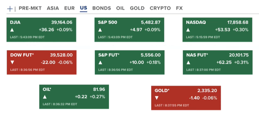 Chứng khoán Hoa Kỳ thứ năm (27/06) kết thúc phiên cả ba chỉ số đều tăng. Hợp đồng tương lai của chứng khoán đa số cũng tăng nhẹ. Giá dầu sau khi tăng vẫn giữ quanh 81 USD/thùng. Vàng vẫn quanh 2335 USD/ounce.