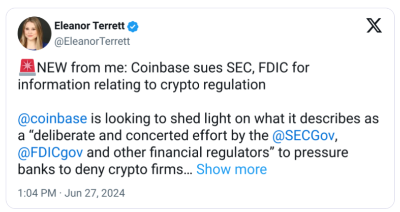 Coinbase đã đệ đơn kiện Ủy ban Chứng khoán và Giao dịch Hoa Kỳ (SEC) và Tổng Công ty Bảo hiểm Tiền gửi Liên bang (FDIC) vì những nỗ lực có chủ ý và phối hợp nhằm phá hủy ngành công nghiệp crypto. Coinbase cáo buộc rằng SEC và FDIC đã gây áp lực lên các ngân hàng để từ chối cung cấp dịch vụ cho các công ty crypto.