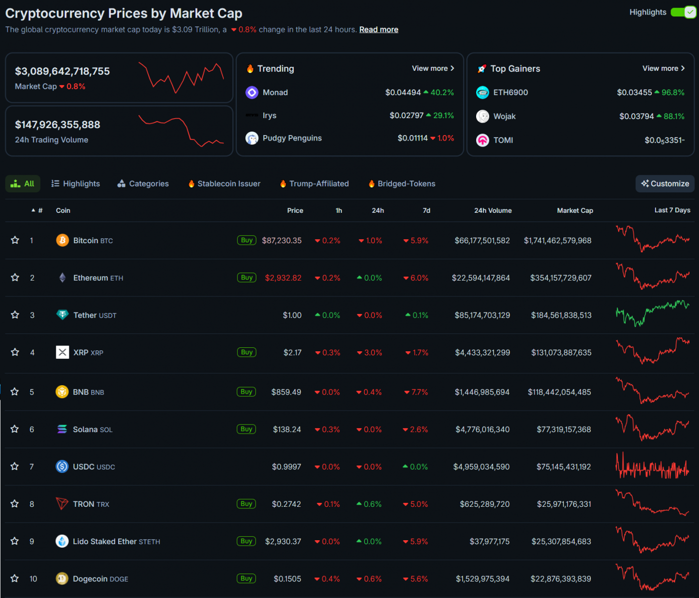 Bitcoin cũng điều chỉnh giảm quanh 87,200 USD. Cá altcoin lớn hầu hết giảm nhẹ hoặc đi ngang. Vốn hóa thị trường crypto giảm xuống 3.08 nghìn tỷ USD.