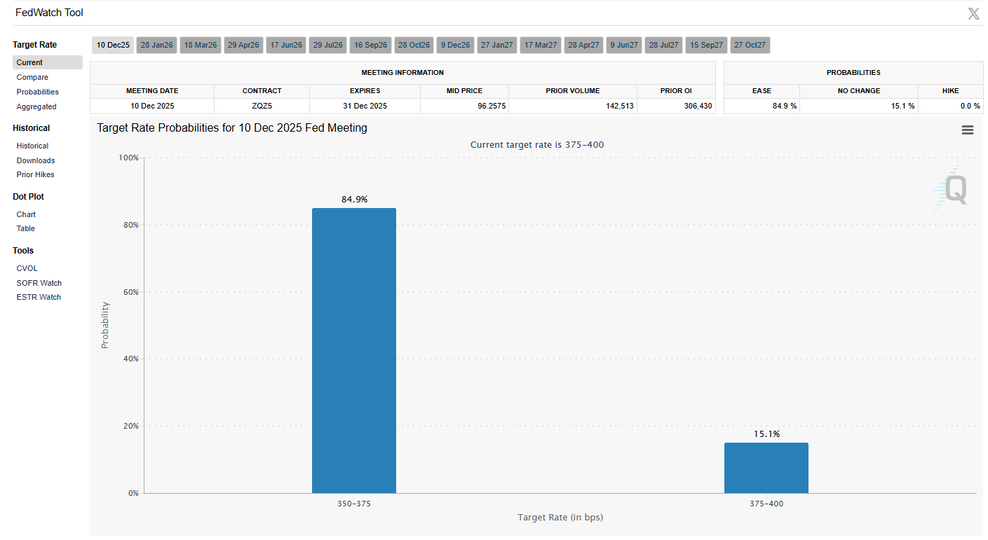 Đây là chỉ số đo giá sản xuất, không phải giá tiêu dùng. Tuy nhiên, dữ liệu cho thấy không có dấu hiệu áp lực lạm phát, qua đó tiếp tục hỗ trợ khả năng FED giảm lãi suất vào tháng 12. Hợp đồng CME của Fed cho thấy thị trường cho rằng hơn 84.9% khả năng Fed sẽ giảm lãi suất trong cuộc họp vào ngày 10 tháng 12 tới.