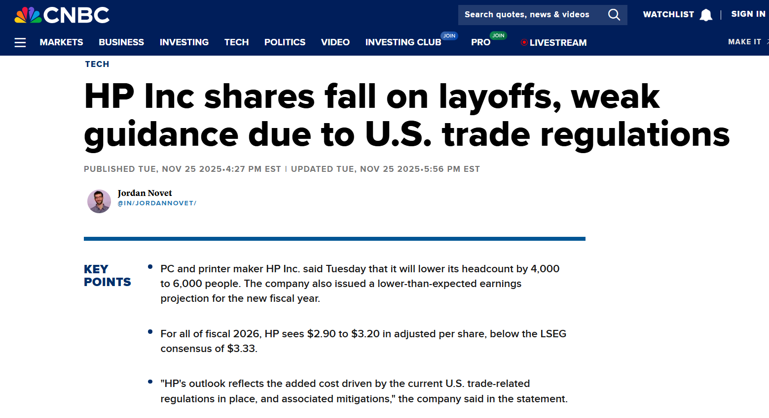 Theo nhận định chung, áp lực lớn đối với kinh tế Mỹ trong thời gian tới có thể đến từ thị trường lao động và sự suy giảm nhu cầu tuyển dụng, trong đó làn sóng cắt giảm nhân sự tại nhiều tập đoàn lớn như HP (cắt giảm khoảng 6,000 nhân viên) hay Amazon được cho là có liên quan một phần đến quá trình ứng dụng AI và tái cấu trúc mô hình vận hành. Dù nhiều doanh nghiệp phủ nhận việc sa thải vì AI, thực tế cho thấy cùng một khối lượng công việc, trước đây cần 6–7 người thì nay chỉ cần 1–2 người với sự hỗ trợ của công nghệ, làm giảm mạnh nhu cầu nhân sự và tạo thêm áp lực lên thị trường việc làm.