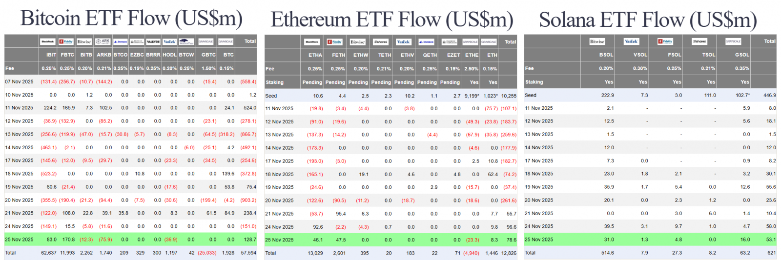 Đầu tiên, về dòng tiền vào các quỹ BTC spot ETF Hoa Kỳ trong thứ ba (25/11-US) đã có 128.7 triệu USD tiền vào trở lại. Tương tự, ETH spot ETF cũng có tiền vào 78.6 triệu USD. Còn SOL vẫn đều đặn có tiền vào 53.1 triệu USD.